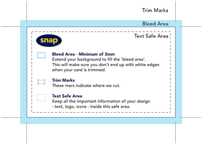 Bleed refers to a minimum extra 3mm of image or background color that extends beyond the trim area of your printing piece. The project is printed on an oversized sheet that is then cut down to size with the appearance that the image is “bleeding” off the edge of the paper.